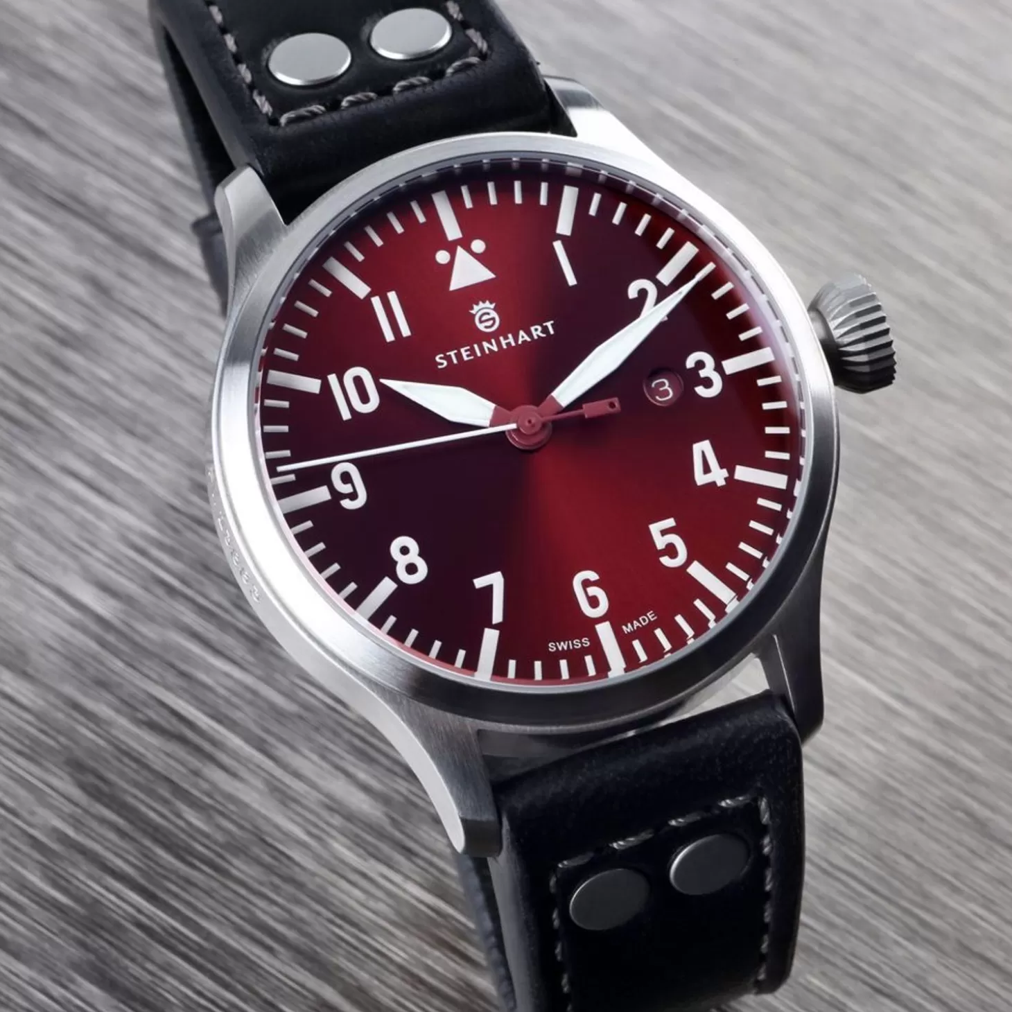 Het Pilot Watch-Nav. B 44 Date Red Gemaakt Door Steinhart Is Ontworpen Op Basis Van Historische Modellen. De Prachtige Geborstelde Roestvrijstalen Kast Met De Grote Kroon Laat Het Hart Van Elke Horlogeliefhebber Sneller Kloppen.